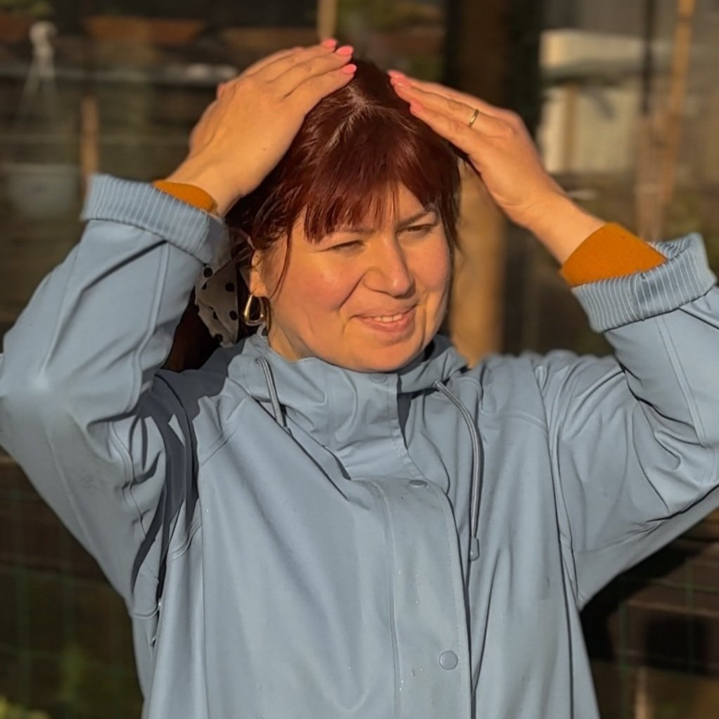 Eine lachende Frau mit braunen Haaren, die ihre Hände auf den Kopf legt, trägt eine hellblaue Jacke. Sie steht vor einem unscharfen Hintergrund im Freien. Gartenfuchs.